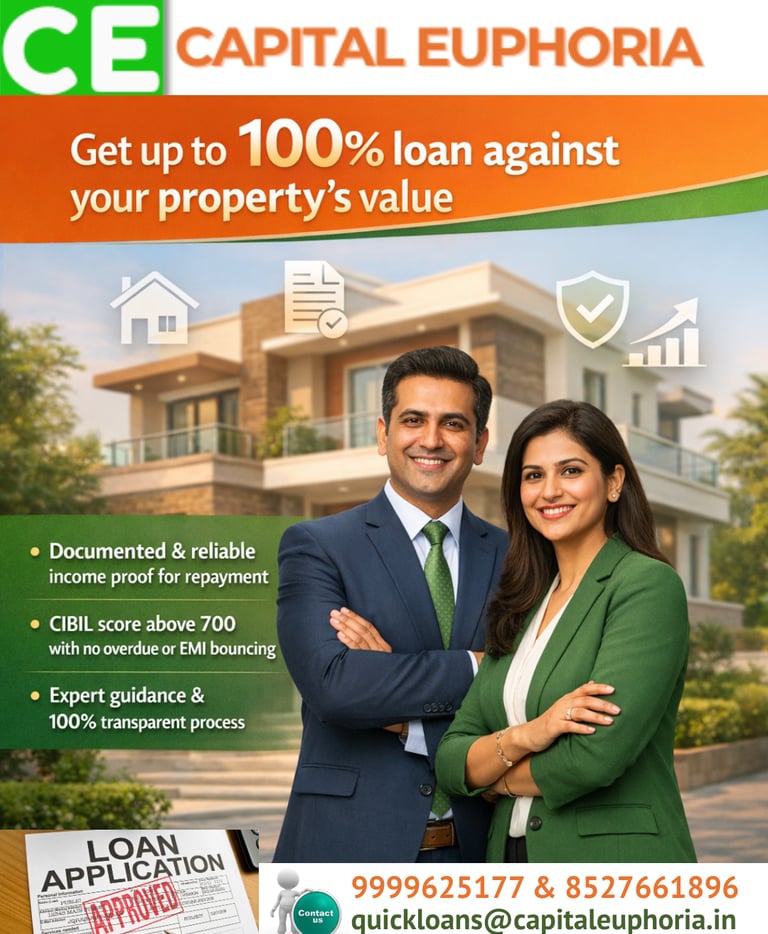 At Capital Euphoria, we offer Loan Against Property (LAP) solutions to help business owners, professionals, and individuals leverage their propertyβs value for substantial funding. With loan amounts up to 100% you can fulfill your business expansion plans, manage working capital, or meet personal financial needs with ease.
